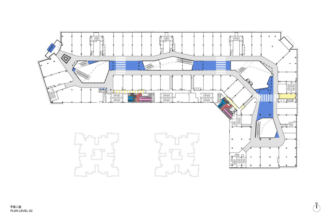 明亮的颜色和电梯、连桥、阳台等建筑元素共同构成了一个直观的寻路系统,在连接多个楼层的同时,引导游客自然而然地穿行于不同的空间。商店、岛铺、咖啡店散布其中,将走廊和中庭转变为充满活力的社交空间,以供游客在探索的途中驻足停留。