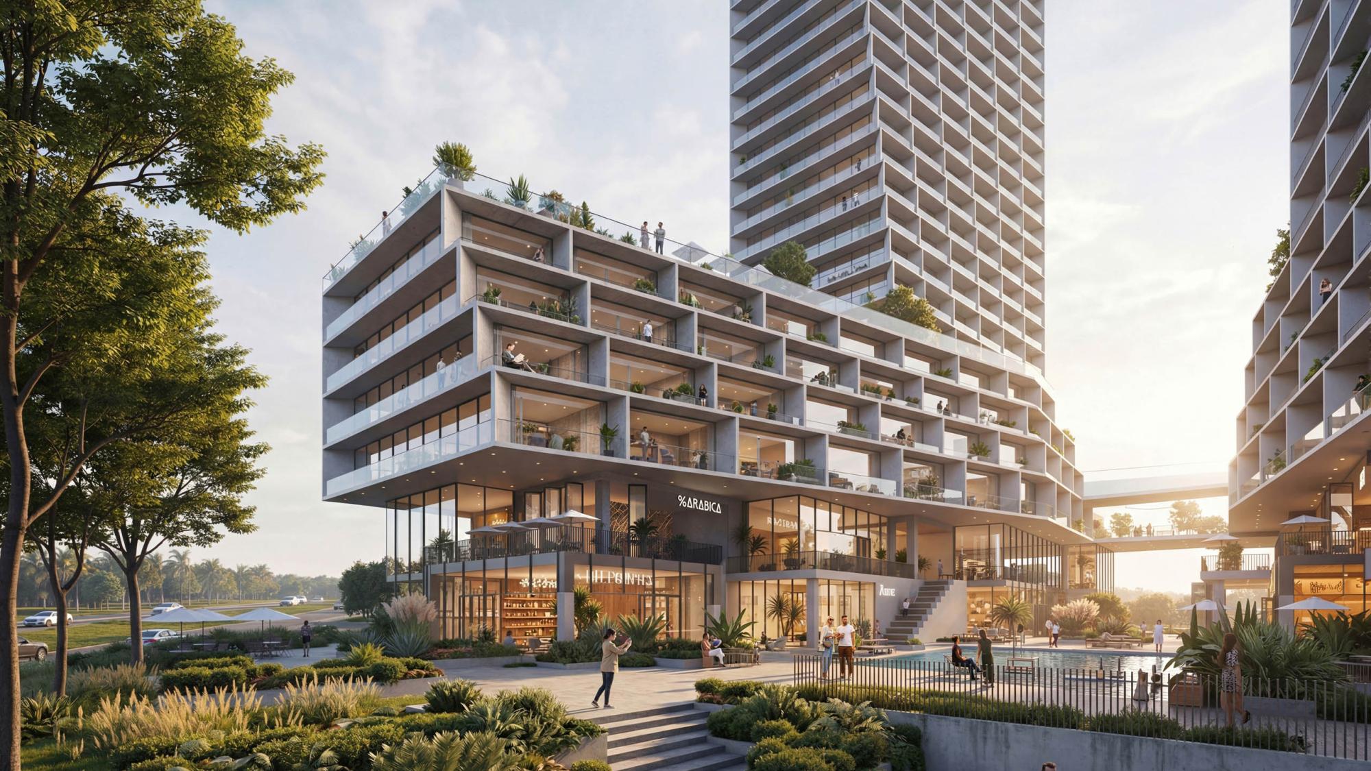 项目配套设施包括四个泳池、SPA与健身中心、社区艺廊及小型市场,促进居民之间的日常互动与社群归属感。
