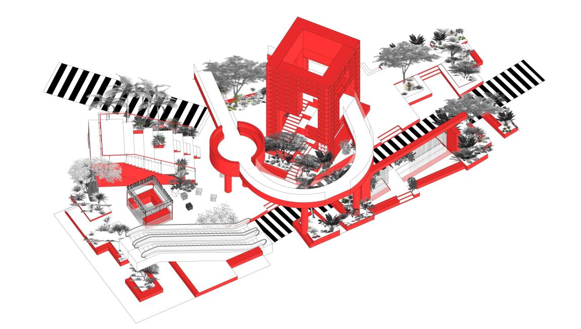 在中心区域,我们引入了一个两层高的红色立方作为整个空间的焦点,作为中庭的垂直交通,周围被绿植和水景环绕。让人联想到卢梭画作里奇幻的场景:鲜艳的色彩和明暗对比,原始率真的手法,营造神秘、充满想象力的超现实主义氛围。